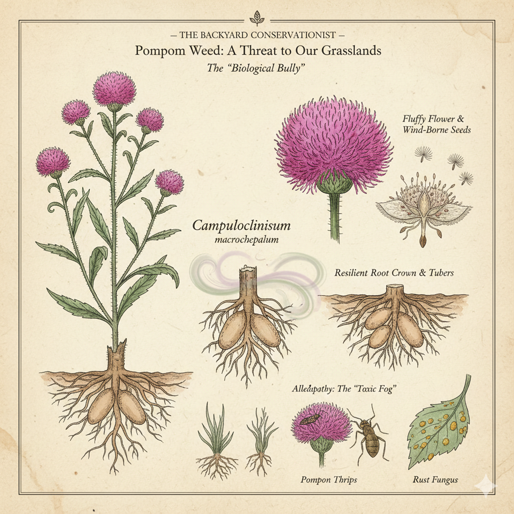 Think of the Pompom weed as a neighbour who doesn’t just take the best seat in the house—it releases a “toxic fog” that makes it impossible for the original residents to survive.